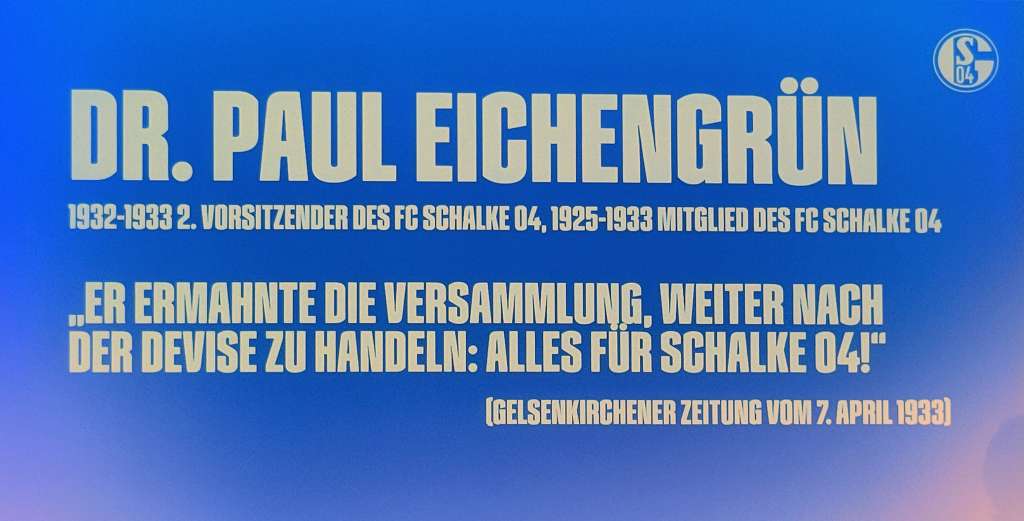 Am Beispiel von Paul Eichengrün zeigte Thomas Spiegel vom Team Tradition des FC Schalke 04, wie groß die Rolle von Juden beim Aufbau des deutschen Fußballs war. Eichengrün wurde 1932 zum zweiten Vorsitzenden des FC Schalke 04 gewählt und nahm die Wahl mit den Worten „Alles für Schalke“ an. 1933 kam dann in Deutschland die NSDAP an die Macht, deren Kampforganisation SA unter dem Slogan „Alles für Deutschland“ prügelte und mordete. Unter dem Druck der Nazis trat Eichengründ von seinem Amt zurück. So wollte er Schaden von seinem Verein abwenden, dem er weiter mit ganzem Herzen verbunden blieb. Heute ist der Slogan der NSDAP verboten, während der von Eichengrün als Aufkleber in Gelsenkirchen verbreitet wird.