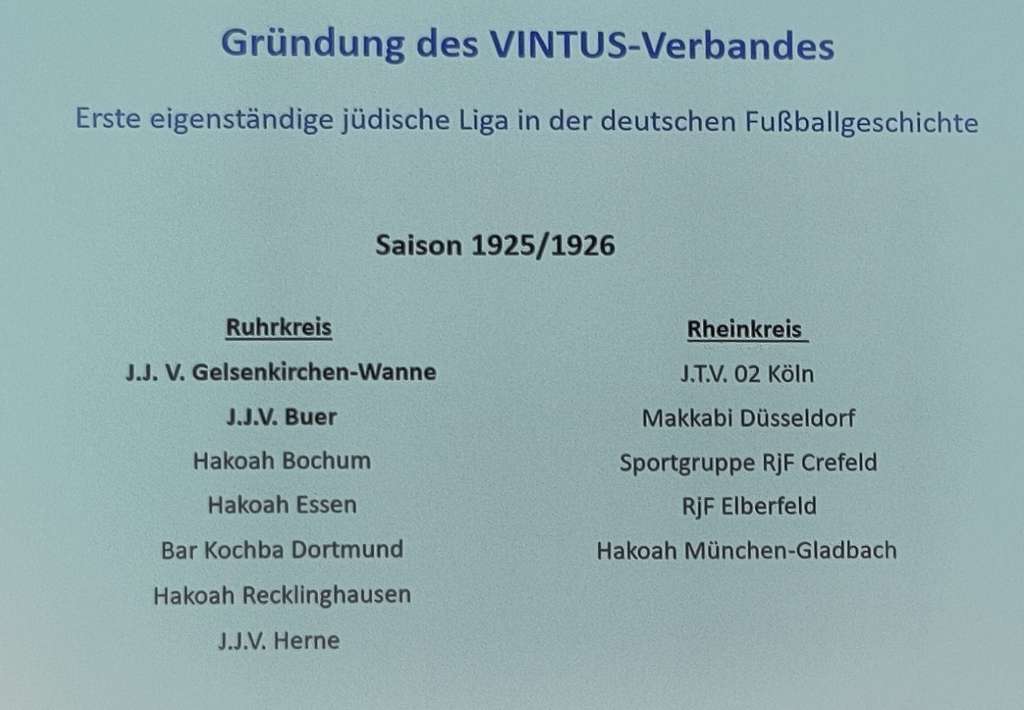 Fußball hingegen sei eine neue Sportart gewesen, die vor allem von England nach Deutschland kam. Im Jahr 1898 wurde in Berlin der erste Jüdische Turn- und Sportverein Bar Kochba gegründet, 1903 Makkabi Deutschland als Dachverband und 1923 der FC Maccabi Düsseldorf. Und so boomte in der Zeit der Weimarer Republik bis 1933 der jüdische Fußball und machte diese Sportart groß. Unter den Nationalsozialisten wurde diese Tradition brutal unterbrochen. Aber nach der Befreiung 1945 lebte der Fußball wieder auf. So begannen Juden in den Displaced-Person-Camps, in denen wohnungslose Überlebende in den ersten Jahren nach 1945 untergebracht wurden, Vereine zu gründen.